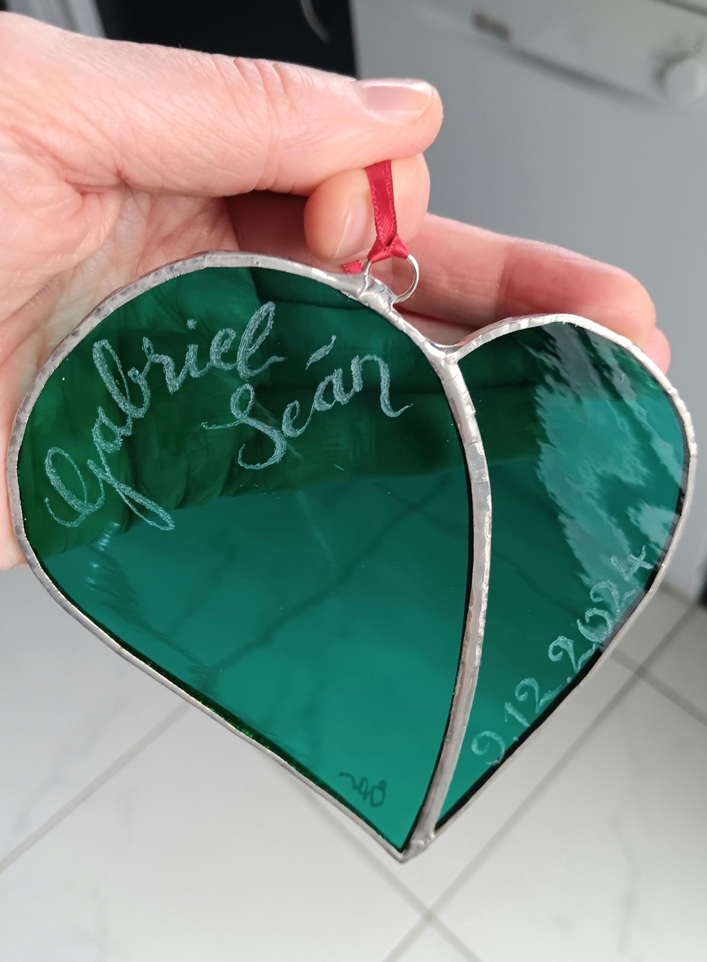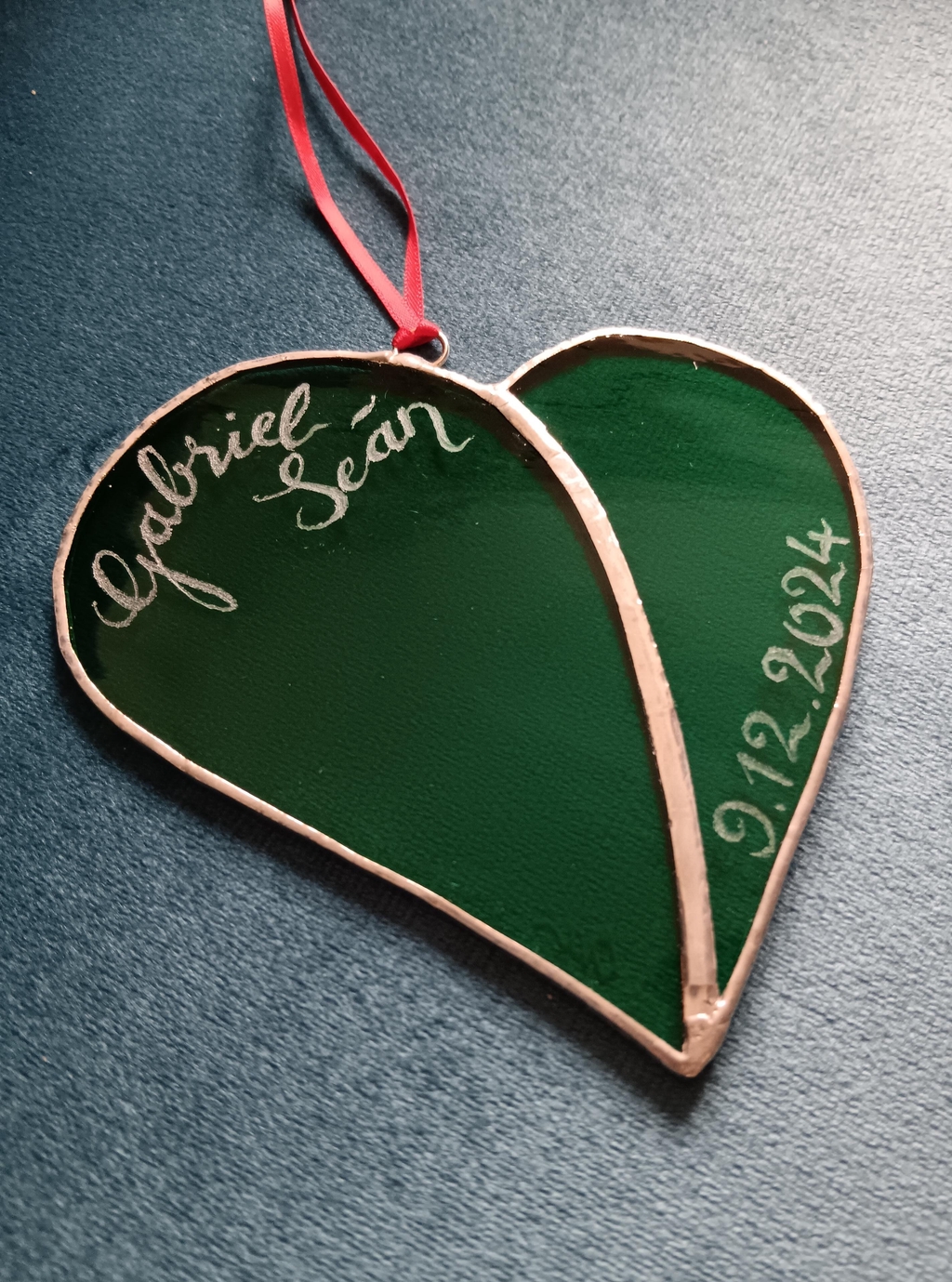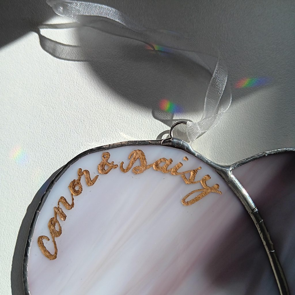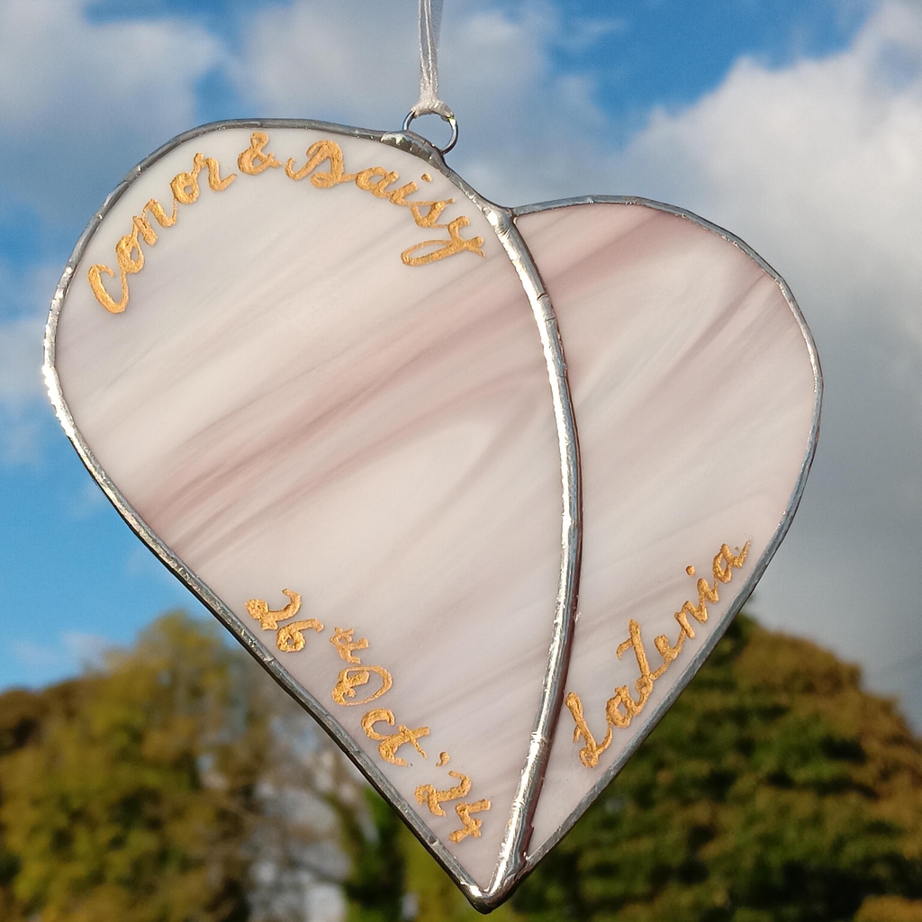 Bespoke wedding gift engraved and gilt with names of married couple, place and date of wedding on semi-transparent stained glass heart light-catcher. Personalised christening/birth gift with name of baby and date they were born on transparent stained glass heart light-catcher.
