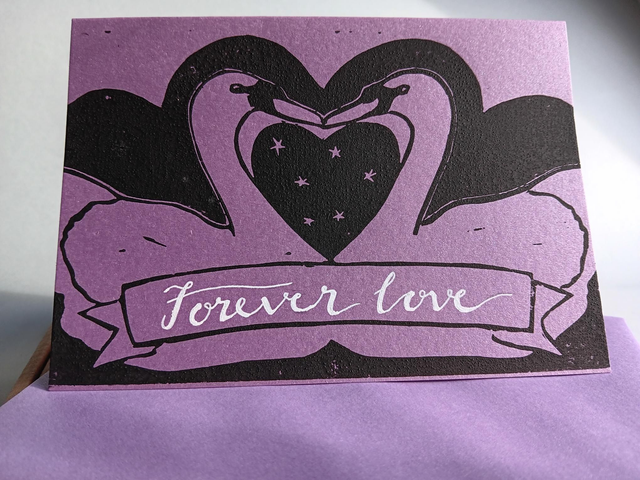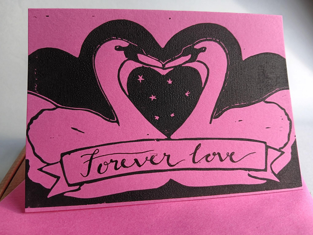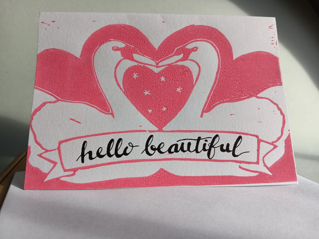 Original hand-printed lino-cut of a pair of swans with attractive calligraphy handwritten on scroll. Ideal card for a loved one, or for a wedding, anniversary or Valentine's Day. There are 2 types available, 'forever love' (3 variations), and 'hello beautiful'.