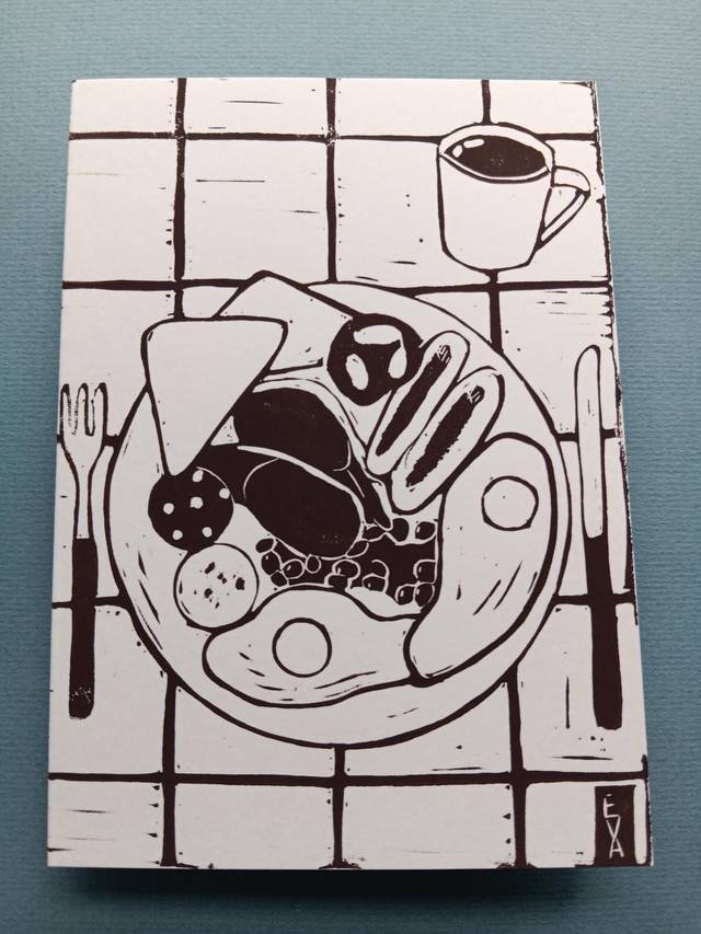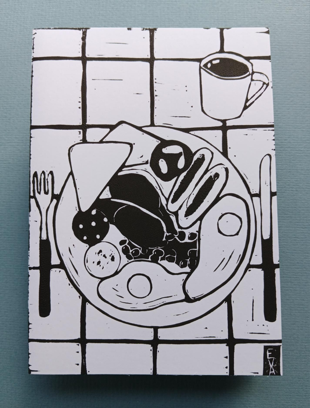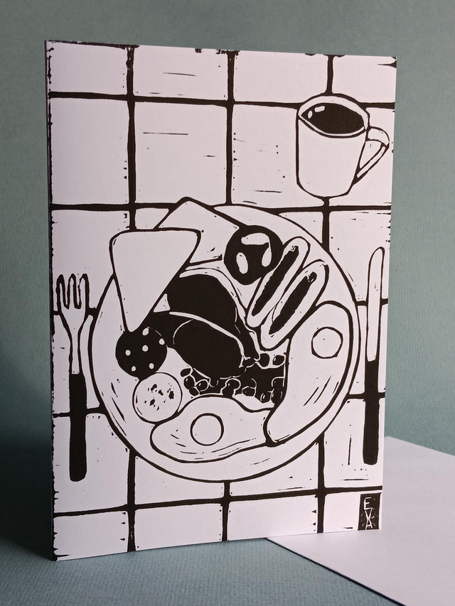 Original hand-printed lino-cut of a fry-up. The message inside reads 'The Full Irish'. Ideal handmade Irish card for sending someone overseas a taste of home and a taste of Irish culture.